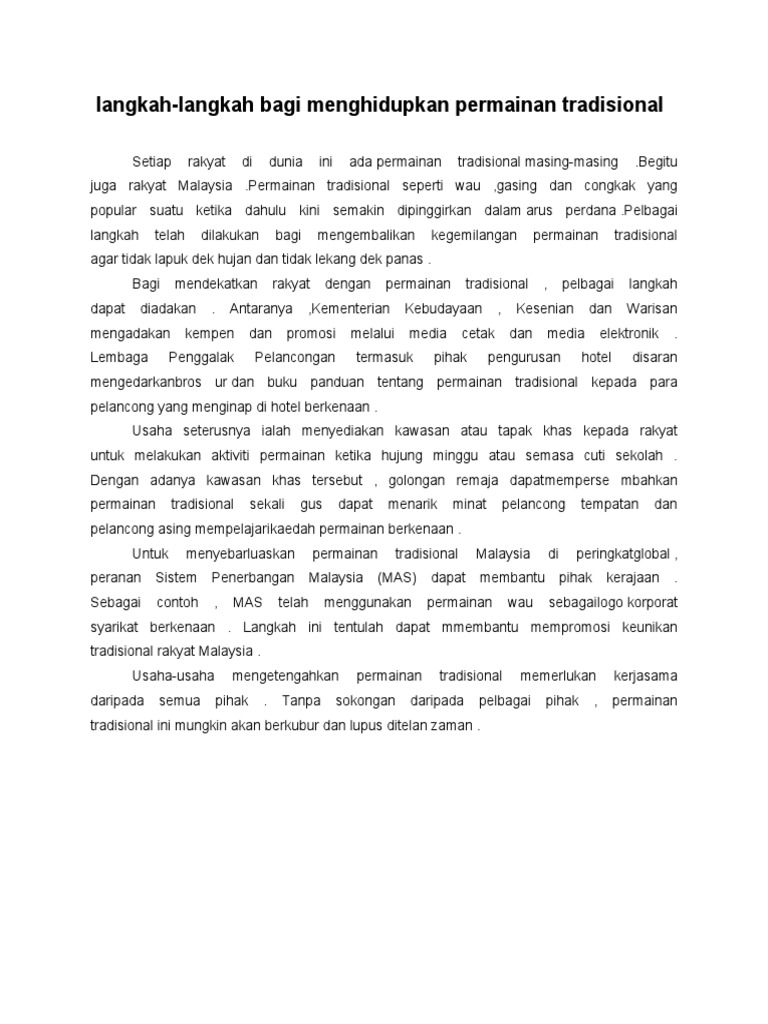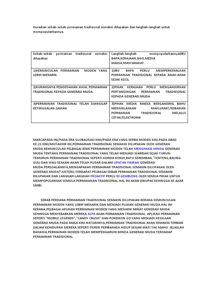 Bincangkan sebab sebab permainan tradisional semakin dilupakan dan langkah from BM 11031 at SMK Khir Johari. Namun demikian permainan tradisional semakin dilupakan oleh generasi muda. Selain memperkenalkan sejarah dan cara bermain pihak media perlu memberikan kesedaran kepada orang ramai akan kepentingan permainan tradisional kepada masyarakat dan negara.